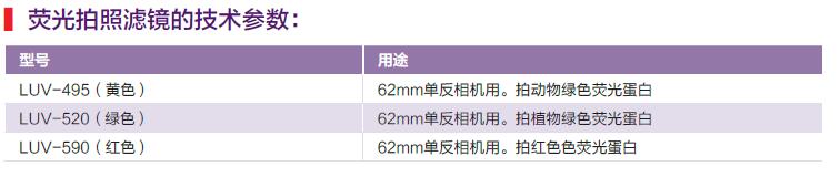 GFP熒光蛋白激發光源取照需要拍照濾鏡,熒光拍照濾鏡直徑為62mm,能夠適配62mm鏡頭的單反相機。