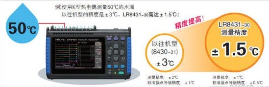 例如:使用K型熱電偶測量50℃的水溫,以往機型的精度是±3℃,LR8431-30高達±1.5℃